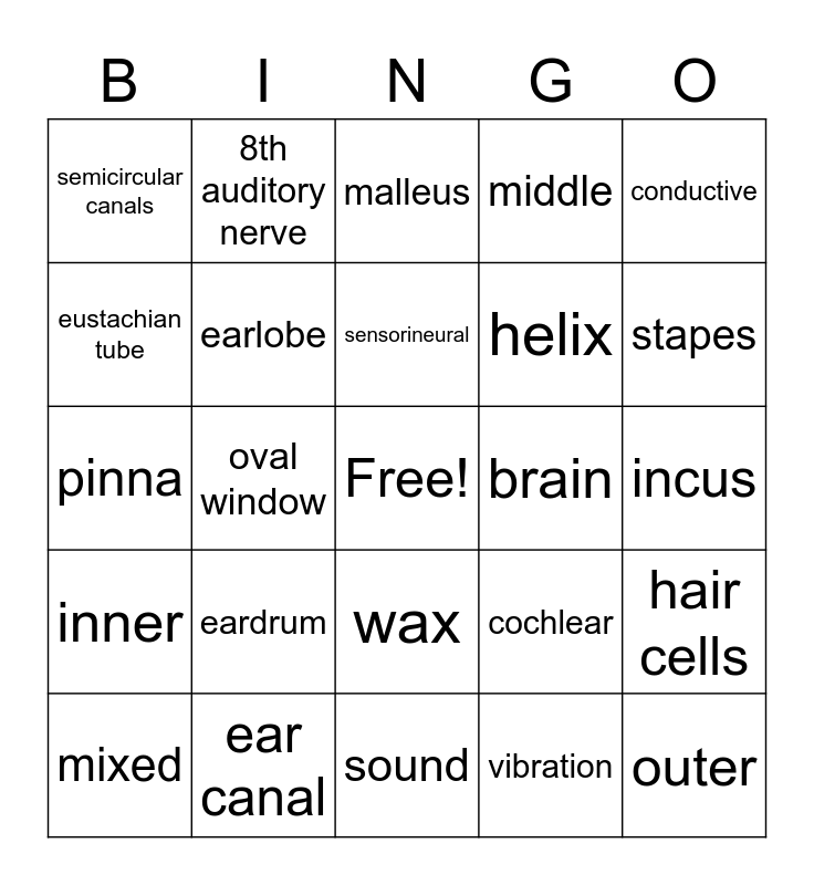This bingo card has a free space and 24 words: eardrum, ear canal, sensorineural, mixed, conductive, semicircular canals, eustachian tube, 8th auditory nerve, brain, wax, helix, pinna, cochlear, hair cells, earlobe, vibration, incus, malleus, stapes, oval window, outer, inner, middle and sound.