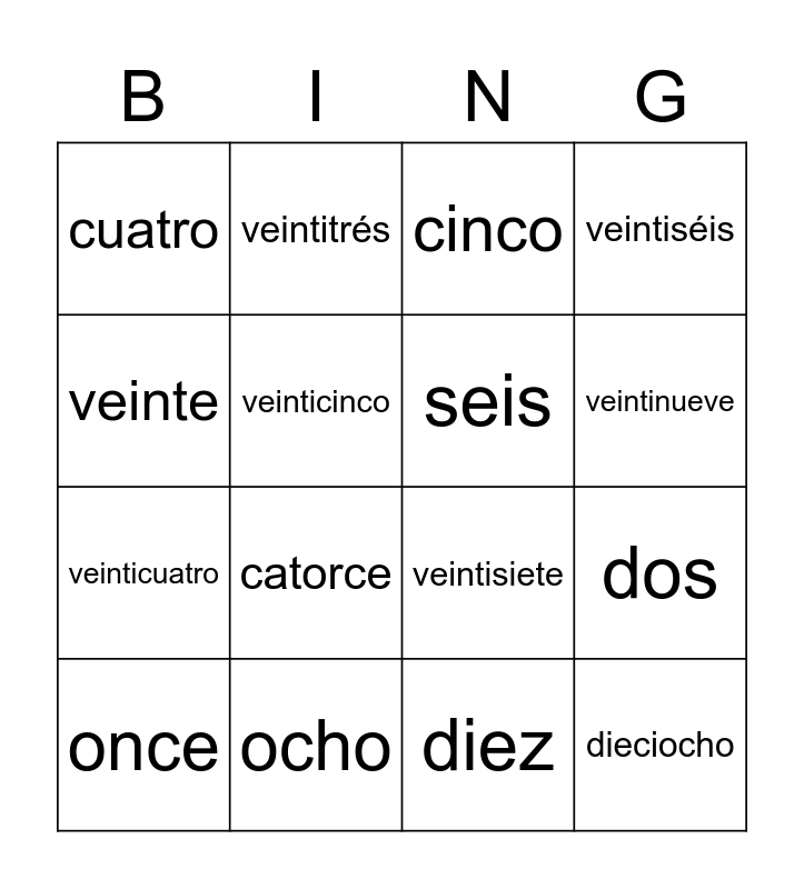 This bingo card has 31 words: cero, uno, dos, tres, cuatro, cinco, seis, siete, ocho, nueve, diez, once, doce, trece, catorce, quince, dieciséis, diecisiete, dieciocho, diecinueve, veinte, veintiuno, veintidós, veintitrés, veinticuatro, veinticinco, veintiséis, veintisiete, veintiocho, veintinueve and treinta.