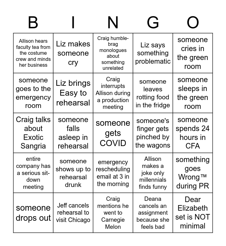 This bingo card has a free space and 24 words: someone shows up to rehearsal drunk, Jeff cancels rehearsal to visit Chicago, Craig interrupts Allison during a production meeting, someone drops out, someone cries in the green room, Allison hears faculty tea from the costume crew and minds her business, someone goes to the emergency room, Liz makes someone cry, someone's finger gets pinched by the wagons, emergency rescheduling email at 3 in the morning, someone leaves rotting food in the fridge, Craig talks about Exotic Sangria, Allison makes a joke only millennials finds funny, something goes Wrong™ during PR, Liz brings Easy to rehearsal, Deana cancels an assignment because she feels bad, someone spends 24 hours in CFA, Craig humble- brag monologues about something unrelated, someone sleeps in the green room, someone falls asleep in rehearsal, Dear Elizabeth set is NOT minimal, entire company has a serious sit-down meeting, Liz says something problematic and Craig mentions he went to Carnegie Melon.