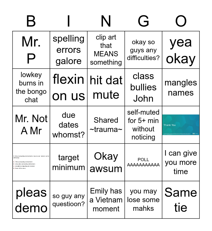 This bingo card has 2 images, a free space and 22 words: pleas demo, target minimum, hit dat mute, you may lose some mahks, yea okay, Mr. P, spelling errors galore, clip art that MEANS something, self-muted for 5+ min without noticing, Mr. Not A Mr, flexin on us, POLL AAAAAAAAAAA, I can give you more time, lowkey burns in the bongo chat, so guy any questioon?, Emily has a Vietnam moment, okay so guys any difficulties?, mangles names, due dates whomst?, Okay awsum, class bullies John and Same tie.