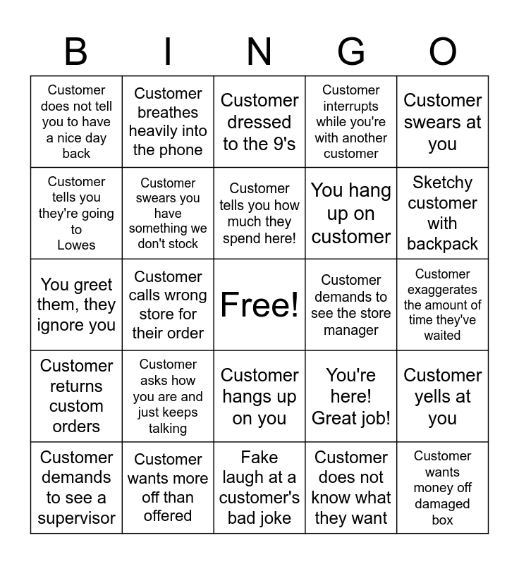 This bingo card has a free space and 25 words: Customer asks how you are and just keeps talking, Fake laugh at a customer's bad joke, Customer tells you how much they spend here!, Customer demands to see a supervisor, Customer swears at you, Customer does not tell you to have a nice day back, Customer tells you they're going to Lowes, Customer breathes heavily into the phone, Customer demands to see the store manager, Customer hangs up on you, You hang up on customer, You greet them, they ignore you, You're here! Great job!, Customer yells at you, Customer swears you have something we don't stock, Customer is overly affectionate, Customer exaggerates the amount of time they've waited, Customer dressed to the 9's, Sketchy customer with backpack, Customer calls wrong store for their order, Customer wants money off damaged box, Customer wants more off than offered, Customer returns custom orders, Customer interrupts while you're with another customer and Customer does not know what they want.