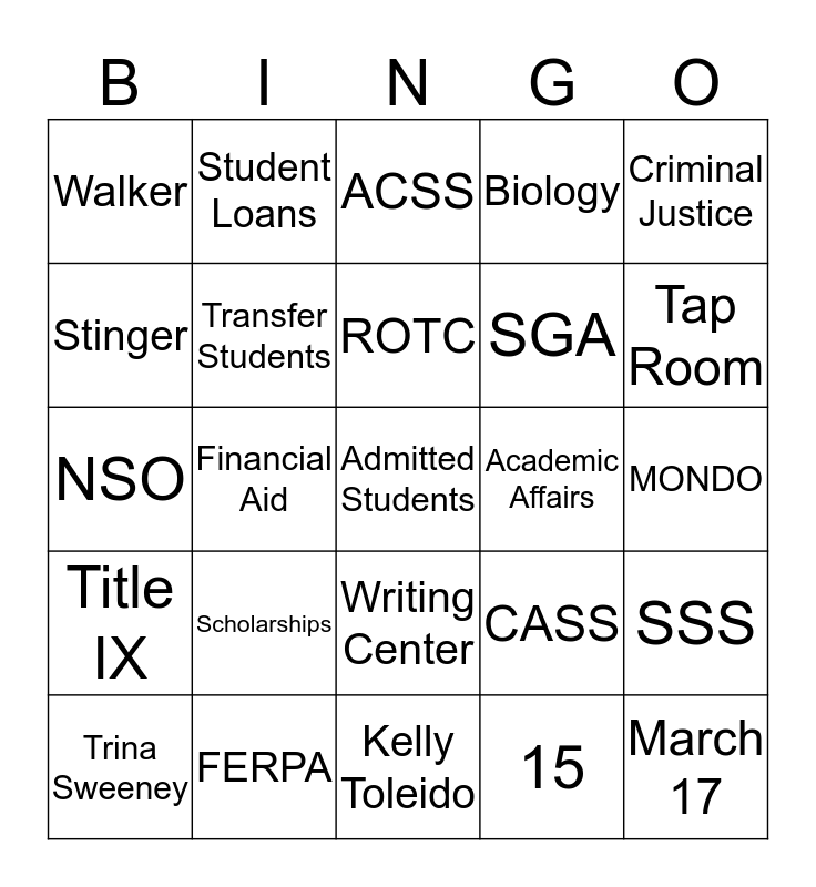 This bingo card has a free space and 24 words: Scholarships, FERPA, ROTC, Trina Sweeney, Criminal Justice, Walker, Stinger, Student Loans, Academic Affairs, Writing Center, SGA, NSO, CASS, SSS, Transfer Students, 15, MONDO, ACSS, Tap Room, Financial Aid, March 17, Title IX, Biology and Kelly Toleido.