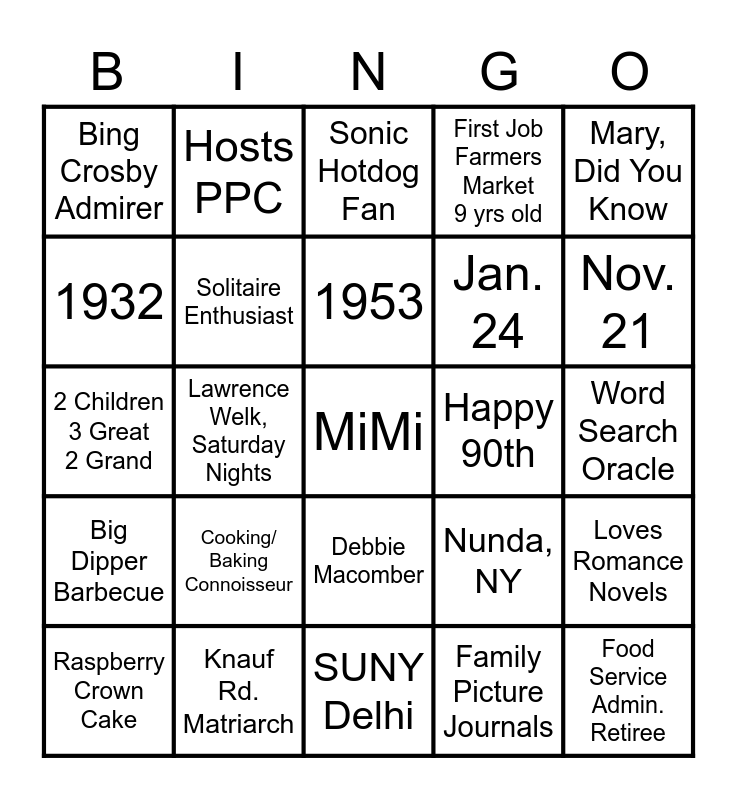 This bingo card has a free space and 24 words: Cooking/ Baking Connoisseur, Knauf Rd. Matriarch, 1953, Raspberry Crown Cake, Mary, Did You Know, Bing Crosby Admirer, 1932, Hosts PPC, Happy 90th, Debbie Macomber, Jan. 24, 2 Children 3 Great 2 Grand, Nunda, NY, Loves Romance Novels, Solitaire Enthusiast, Family Picture Journals, Word Search Oracle, Sonic Hotdog Fan, Nov. 21, Lawrence Welk, Saturday Nights, Food Service Admin. Retiree, Big Dipper Barbecue, First Job Farmers Market 9 yrs old and SUNY Delhi.