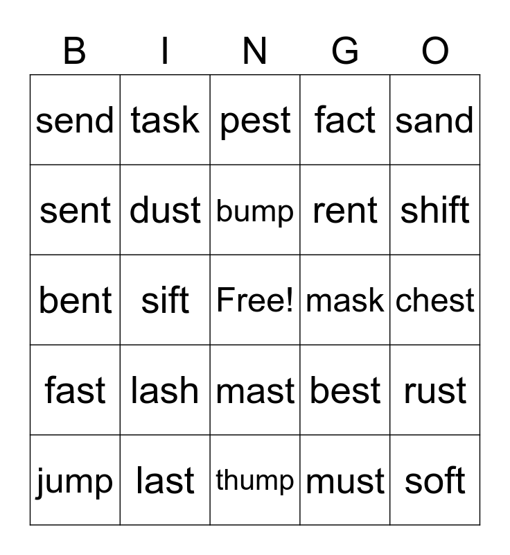 This bingo card has a free space and 24 words: lash, last, bump, jump, sand, send, sent, task, mask, mast, rent, bent, best, rust, dust, must, chest, pest, shift, sift, soft, fast, fact and thump.
