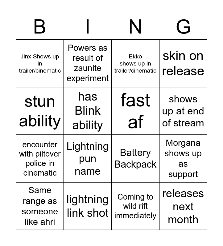 This bingo card has 16 words: lightning link shot, Morgana shows up as support, Ekko shows up in trailer/cinematic, Jinx Shows up in trailer/cinematic, encounter with piltover police in cinematic, Powers as result of zaunite experiment, Battery Backpack, Coming to wild rift immediately, stun ability, has Blink ability, Same range as someone like ahri, skin on release, Lightning pun name, shows up at end of stream, fast af and releases next month.