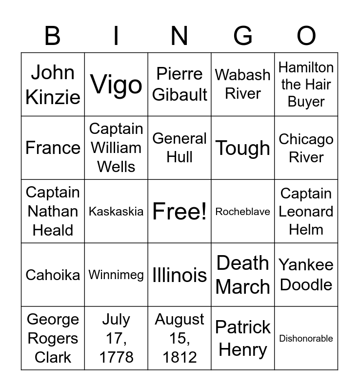 This bingo card has a free space and 24 words: George Rogers Clark, Winnimeg, General Hull, Patrick Henry, Hamilton the Hair Buyer, John Kinzie, Vigo, Pierre Gibault, Rocheblave, Captain Leonard Helm, Captain Nathan Heald, Captain William Wells, Death March, Yankee Doodle, France, July 17, 1778, August 15, 1812, Wabash River, Chicago River, Cahoika, Kaskaskia, Illinois, Tough and Dishonorable.