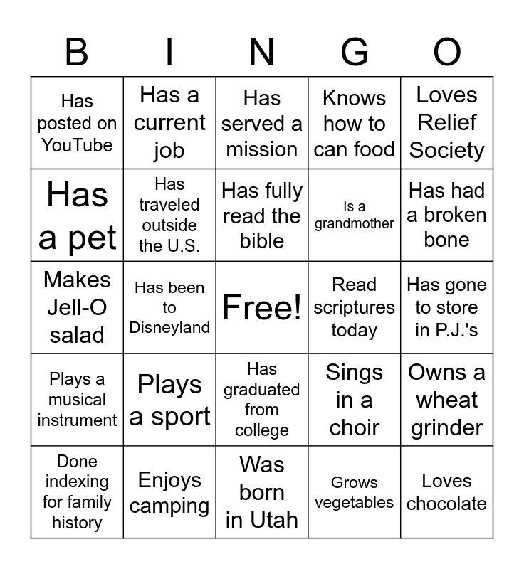This bingo card has a free space and 24 words: Plays a sport, Enjoys camping, Has fully read the bible, Done indexing for family history, Loves Relief Society, Has posted on YouTube, Has a pet, Has a current job, Read scriptures today, Has graduated from college, Is a grandmother, Makes Jell-O salad, Sings in a choir, Owns a wheat grinder, Has traveled outside the U.S., Grows vegetables, Has gone to store in P.J.'s, Has served a mission, Has had a broken bone, Has been to Disneyland, Loves chocolate, Plays a musical instrument, Knows how to can food and Was born in Utah.