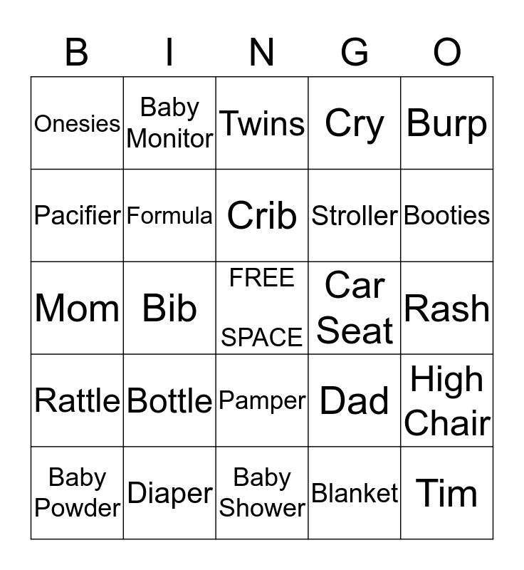 This bingo card has a free space and 24 words: Bottle, Diaper, Crib, Baby Powder, Burp, Onesies, Pacifier, Baby Monitor, Car Seat, Pamper, Stroller, Mom, Dad, High Chair, Formula, Blanket, Rash, Twins, Booties, Bib, Tim, Rattle, Cry and Baby Shower.