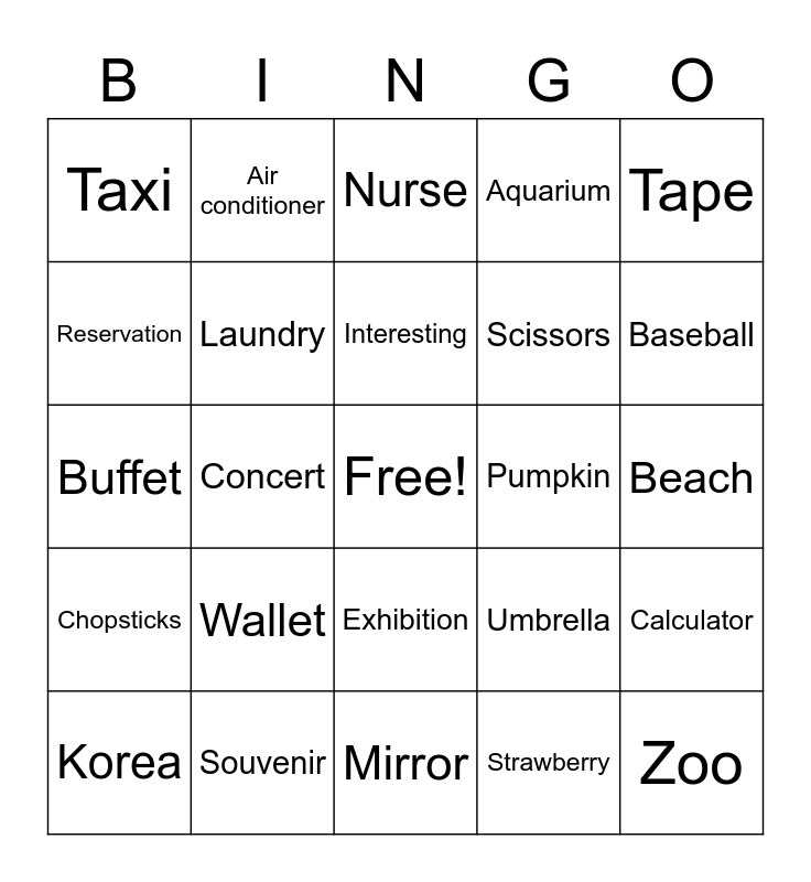 This bingo card has a free space and 74 words: Introduce, Musician, Nurse, Actor, Photographer, Hairdresser, Friend, China, Korea, Kitchen, Bedroom, Family, Interesting, Reservation, Movie, Concert, Party, Baseball, Tour, Buffet, Laundry, Air conditioner, Aquarium, Museum, Zoo, Tickets, Dolphins, Shopping, Postcard, Stamps, Tape, Graduation, Birthday, Envelope, Passport, Strawberry, Mushroom, Jacket, Hat, Sandals, Mirror, Souvenir, Uniform, Marathon, Subway, Taxi, Camera, Wallet, Password, Ankle, Medicine, Toothbrush, Beach, Bicycles, Sunscreen, Alarm clock, Exhibition, Baggage, Airport, Calculator, Scissors, Keyboard, Chopsticks, Seasoning, Pumpkin, Carrot, Octopus, Sunglasses, Umbrella, Snow, Sunshine, Gloves, Chef and Doctor.