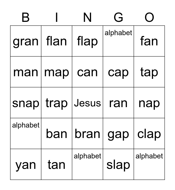 This bingo card has a free space and 24 words: ban, tan, can, yan, fan, gran, man, flan, ran, bran, cap, snap, gap, clap, map, slap, nap, flap, tap, trap, alphabet, alphabet, alphabet and alphabet.