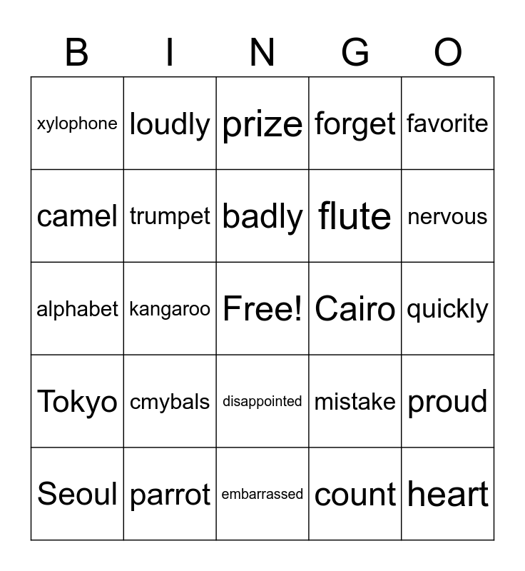 This bingo card has a free space and 24 words: cmybals, parrot, badly, Seoul, favorite, xylophone, camel, loudly, Cairo, disappointed, flute, alphabet, mistake, proud, trumpet, count, quickly, prize, nervous, kangaroo, heart, Tokyo, forget and embarrassed.
