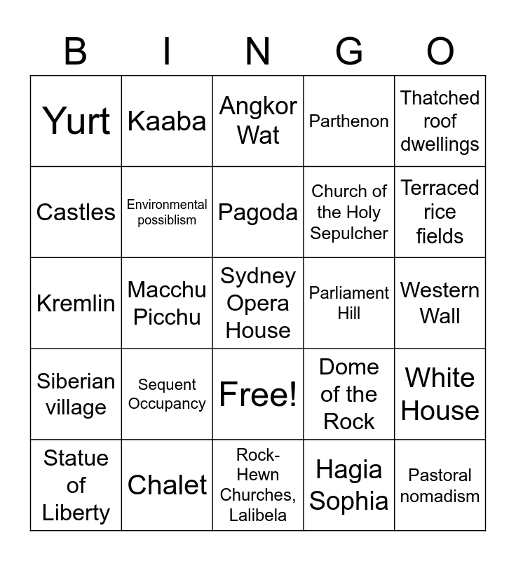 This bingo card has 26 words: Free!, Hagia Sophia, Pagoda, Chalet, Thatched roof dwellings, Yurt, Castles, Kaaba, Western Wall, Dome of the Rock, Church of the Holy Sepulcher, Kremlin, White House, Statue of Liberty, Macchu Picchu, Louvre, Parthenon, Siberian village, Angkor Wat, Sydney Opera House, Terraced rice fields, Rock-Hewn Churches, Lalibela, Parliament Hill, Sequent Occupancy, Environmental possiblism and Pastoral nomadism.