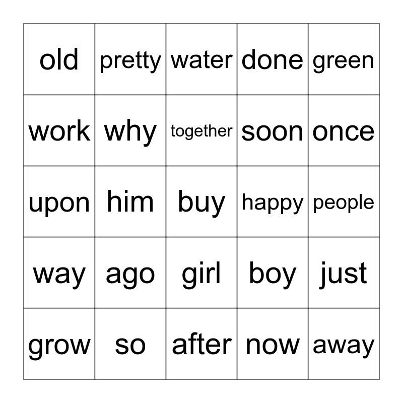 This bingo card has 34 words: away, now, some, today, way, why, green, grow, pretty, should, together, water, any, from, happy, once, so, upon, ago, boy, girl, how, old, people, after, buy, done, every, soon, work, as, him, just and think.