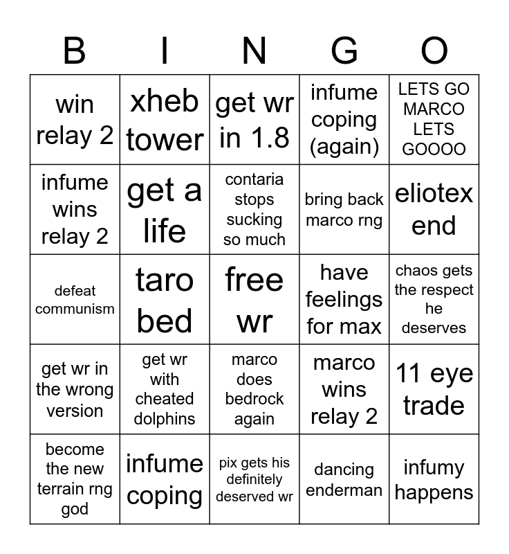 This bingo card has a free space and 24 words: get wr with cheated dolphins, infume coping, contaria stops sucking so much, become the new terrain rng god, LETS GO MARCO LETS GOOOO, win relay 2, infume wins relay 2, xheb tower, have feelings for max, marco does bedrock again, bring back marco rng, defeat communism, marco wins relay 2, 11 eye trade, get a life, dancing enderman, chaos gets the respect he deserves, get wr in 1.8, eliotex end, taro bed, infumy happens, get wr in the wrong version, infume coping (again) and pix gets his definitely deserved wr.