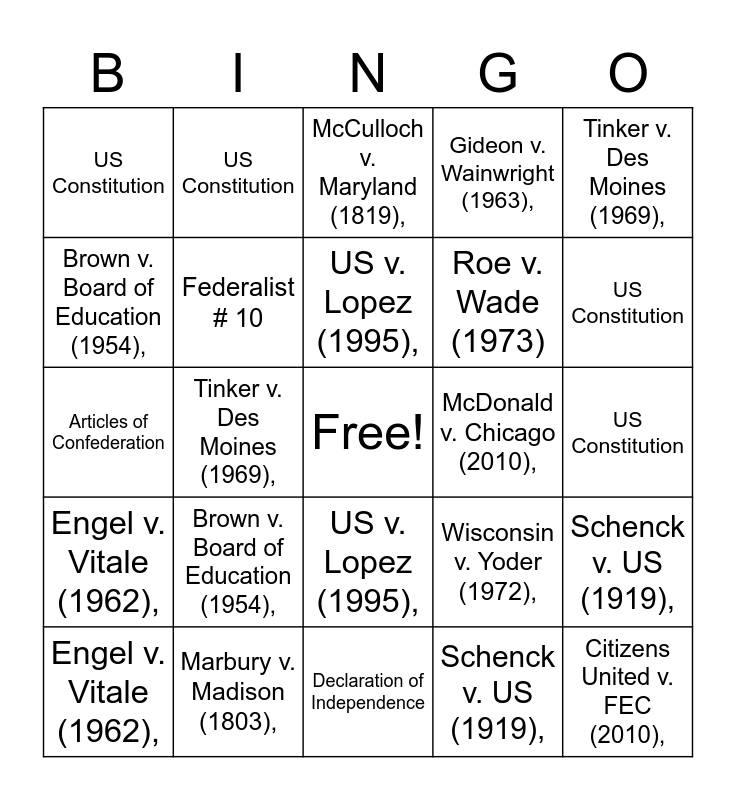 This bingo card has a free space and 44 words: Shaw v. Reno (1993),, Citizens United v. FEC (2010),, Wisconsin v. Yoder (1972),, Engel v. Vitale (1962),, Baker v. Carr (1961),, Schenck v. US (1919),, McCulloch v. Maryland (1819),, NY Times Co. v. US (1971),, Tinker v. Des Moines (1969),, Marbury v. Madison (1803),, Gideon v. Wainwright (1963),, McDonald v. Chicago (2010),, US v. Lopez (1995),, Brown v. Board of Education (1954),, Roe v. Wade (1973), Declaration of Independence, Federalist # 10, Articles of Confederation, US Constitution, US Constitution, US Constitution, US Constitution, US Constitution, US Constitution, US Constitution, US Constitution, Shaw v. Reno (1993),, Citizens United v. FEC (2010),, Wisconsin v. Yoder (1972),, Engel v. Vitale (1962),, Baker v. Carr (1961),, Schenck v. US (1919),, McCulloch v. Maryland (1819),, NY Times Co. v. US (1971),, Tinker v. Des Moines (1969),, Marbury v. Madison (1803),, Gideon v. Wainwright (1963),, McDonald v. Chicago (2010),, US v. Lopez (1995),, Brown v. Board of Education (1954),, Roe v. Wade (1973), Declaration of Independence, Federalist # 10 and Articles of Confederation.