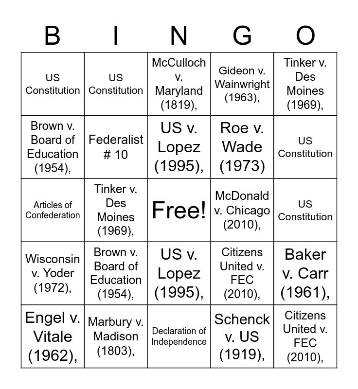 This bingo card has a free space and 45 words: Shaw v. Reno (1993),, Citizens United v. FEC (2010),, Wisconsin v. Yoder (1972),, Engel v. Vitale (1962),, Baker v. Carr (1961),, Schenck v. US (1919),, McCulloch v. Maryland (1819),, NY Times Co. v. US (1971),, Tinker v. Des Moines (1969),, Marbury v. Madison (1803),, Gideon v. Wainwright (1963),, McDonald v. Chicago (2010),, US v. Lopez (1995),, Brown v. Board of Education (1954),, Roe v. Wade (1973), Declaration of Independence, Federalist # 10, Articles of Confederation, US Constitution, US Constitution, US Constitution, US Constitution, US Constitution, US Constitution, US Constitution, US Constitution, US Constitution, Shaw v. Reno (1993),, Citizens United v. FEC (2010),, Wisconsin v. Yoder (1972),, Engel v. Vitale (1962),, Baker v. Carr (1961),, Schenck v. US (1919),, McCulloch v. Maryland (1819),, NY Times Co. v. US (1971),, Tinker v. Des Moines (1969),, Marbury v. Madison (1803),, Gideon v. Wainwright (1963),, McDonald v. Chicago (2010),, US v. Lopez (1995),, Brown v. Board of Education (1954),, Roe v. Wade (1973), Declaration of Independence, Federalist # 10 and Articles of Confederation.