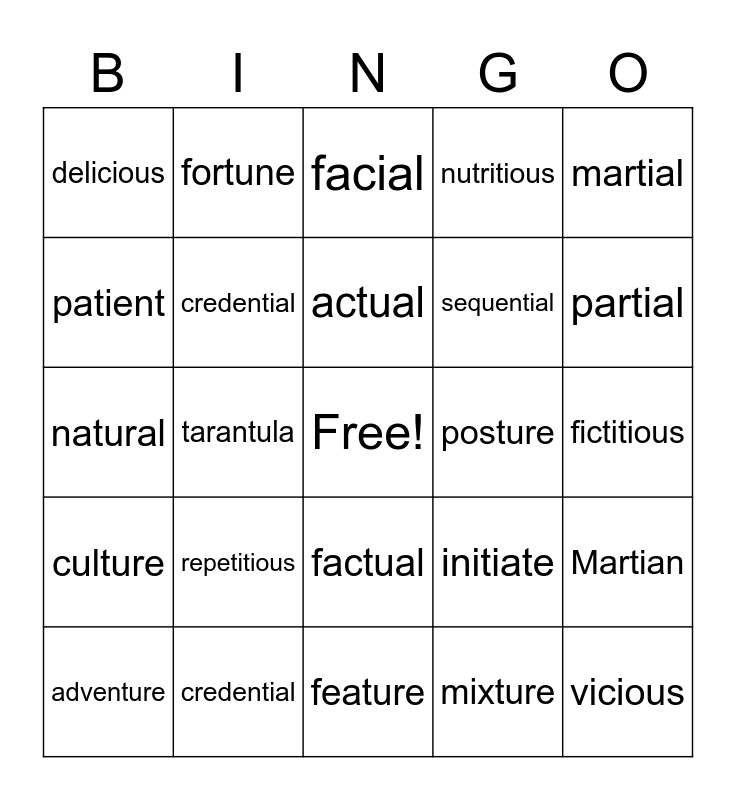 This bingo card has a free space and 29 words: adventure, ambitious, tarantula, spatula, delicious, facial, credential, repetitious, posture, credential, fictitious, vicious, feature, mixture, partial, impatient, factual, culture, martial, natural, initiate, suture, sequential, patient, nutritious, fortune, Martian, actual and congratulate.