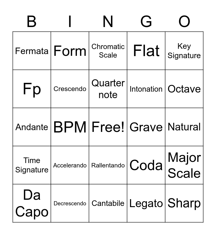 This bingo card has a free space and 41 words: Presto, Andante, Meno Mosso, Crescendo, Decrescendo, Rallentando, Quarter note, Eighth note, Key Signature, Time Signature, BPM, Flat, Sharp, Natural, Grave, Accelerando, Cadenza, Fermata, Ceszura, Chromatic Scale, Major Scale, Minor Scale, Cantabile, Intonation, Marcato, Accent, Legato, Staccato, Octave, Pentatonic scale, Poco a poco, Form, Da Capo, D.S., Coda, Fp, Waltz, 4/4 time, 6/8 time, Cut Time and Allegro.