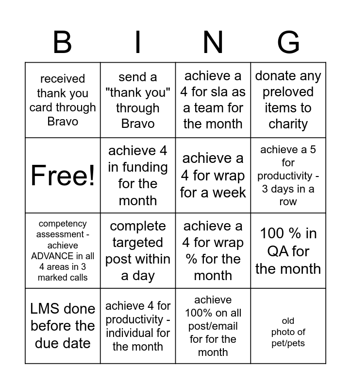 This bingo card has 16 words: achieve 4 for productivity - individual for the month, 100 % in QA for the month, achieve a 4 for sla as a team for the month, received thank you card through Bravo, competency assessment - achieve ADVANCE in all 4 areas in 3 marked calls, send a "thank you" through Bravo, achieve a 4 for wrap % for the month, achieve 100% on all post/email for for the month, Free!, achieve 4 in funding for the month, LMS done before the due date, donate any preloved items to charity, complete targeted post within a day, achieve a 5 for productivity - 3 days in a row, achieve a 4 for wrap for a week and old photo of pet/pets.