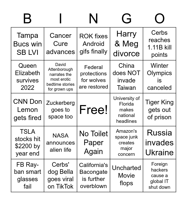 This bingo card has a free space and 24 words: FB Ray-ban smart glasses fail, NASA announces alien life, Federal protections for wolves are restored, Uncharted Movie flops, Cerbs reaches 1.11B kill points, Tampa Bucs win SB LVI, Cancer Cure advances, ROK fixes Android gifs finally, University of Florida makes national headlines, Tiger King gets out of prison, CNN Don Lemon gets fired, David Attenborough narrates the most erotic bedtime stories for grown ups, Amazon's space junk creates major concern, Russia invades Ukraine, Queen Elizabeth survives 2022, Cerbs' dog Bella goes viral on TikTok, California's Bacongate is further overblown, Harry & Meg divorce, Winter Olympics is canceled, TSLA stocks hit $2200 by year end, Zuckerberg goes to space too, No Toilet Paper Again, China does NOT invade Taiwan and Foreign hackers cause a global IT shut down.