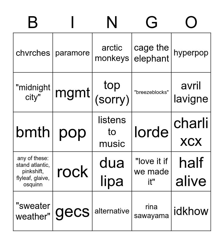 This bingo card has a free space and 24 words: rock, gecs, top (sorry), "sweater weather", hyperpop, chvrches, "midnight city", paramore, lorde, dua lipa, "breezeblocks", bmth, "love it if we made it", half alive, mgmt, rina sawayama, charli xcx, arctic monkeys, avril lavigne, pop, idkhow, any of these: stand atlantic, pinkshift, flyleaf, glaive, osquinn, cage the elephant and alternative.