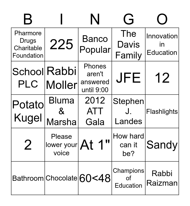 This bingo card has a free space and 24 words: Please lower your voice, Chocolate, Phones aren't answered until 9:00, Bathroom, Innovation in Education, Pharmore Drugs Charitable Foundation, School PLC, 225, Stephen J. Landes, At 1", JFE, Potato Kugel, How hard can it be?, Sandy, Rabbi Moller, Champions of Education, Flashlights, Banco Popular, 12, Bluma & Marsha, Rabbi Raizman, 2, The Davis Family and 60<48.