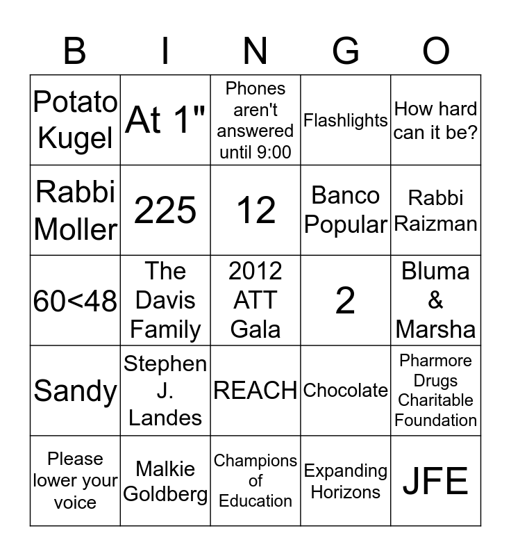 This bingo card has a free space and 24 words: Stephen J. Landes, Malkie Goldberg, 12, Please lower your voice, How hard can it be?, Potato Kugel, Rabbi Moller, At 1", 2, REACH, Banco Popular, 60<48, Chocolate, Pharmore Drugs Charitable Foundation, 225, Expanding Horizons, Bluma & Marsha, Phones aren't answered until 9:00, Rabbi Raizman, The Davis Family, JFE, Sandy, Flashlights and Champions of Education.