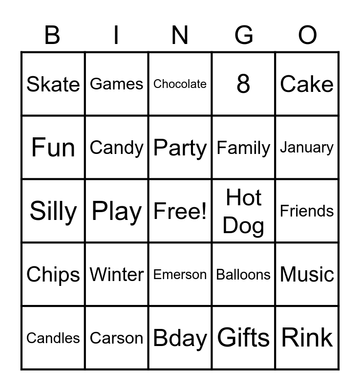 This bingo card has a free space and 24 words: Winter, Carson, Party, Candles, Cake, Skate, Fun, Games, Hot Dog, Emerson, Family, Silly, Balloons, Music, Candy, Gifts, Friends, Chocolate, January, Play, Rink, Chips, 8 and Bday.