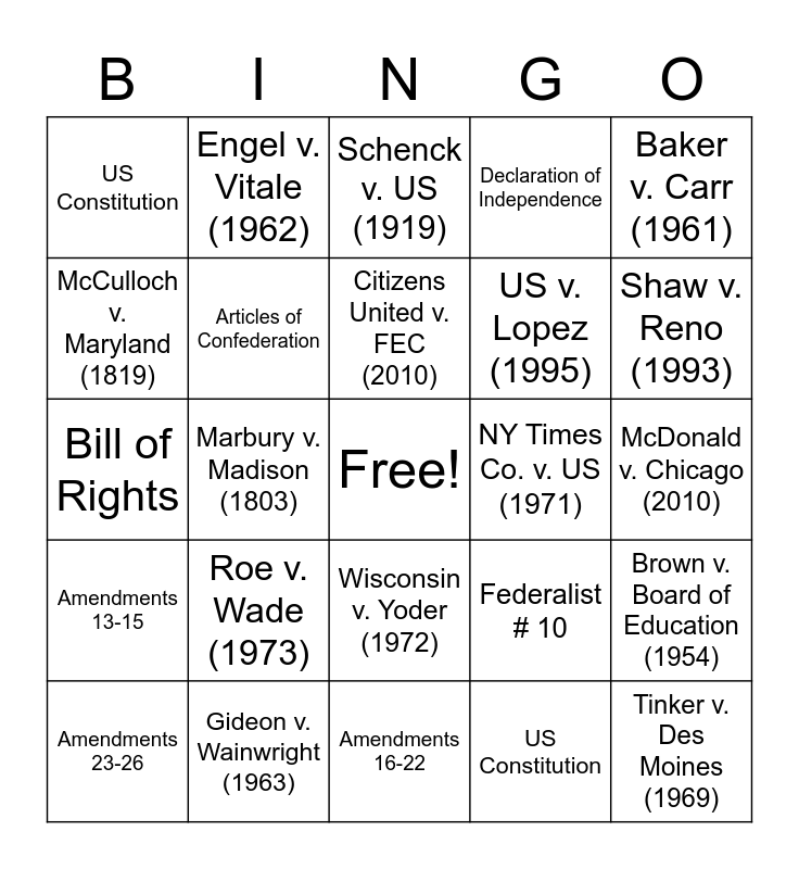 This bingo card has a free space and 24 words: Roe v. Wade (1973), Gideon v. Wainwright (1963), Citizens United v. FEC (2010), Amendments 23-26, Baker v. Carr (1961), US Constitution, McCulloch v. Maryland (1819), Engel v. Vitale (1962), NY Times Co. v. US (1971), Wisconsin v. Yoder (1972), US v. Lopez (1995), Bill of Rights, Federalist # 10, Brown v. Board of Education (1954), Articles of Confederation, US Constitution, McDonald v. Chicago (2010), Schenck v. US (1919), Shaw v. Reno (1993), Marbury v. Madison (1803), Tinker v. Des Moines (1969), Amendments 13-15, Declaration of Independence and Amendments 16-22.