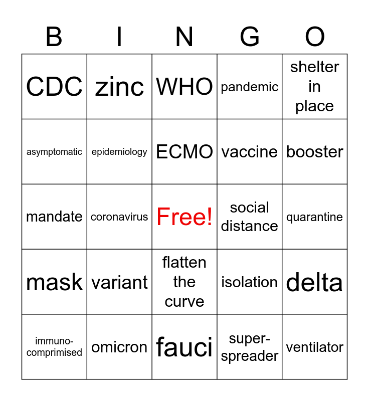 This bingo card has a free space and 24 words: variant, omicron, ECMO, immuno-comprimised, shelter in place, CDC, asymptomatic, zinc, social distance, flatten the curve, vaccine, mandate, isolation, delta, epidemiology, super-spreader, quarantine, WHO, booster, coronavirus, ventilator, mask, pandemic and fauci.