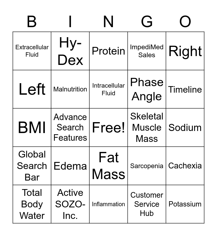 This bingo card has a free space and 25 words: Edema, Inflammation, Intracellular Fluid, Total Body Water, Right, Extracellular Fluid, Left, Hy-Dex, Skeletal Muscle Mass, Fat Mass, Phase Angle, BMI, Sarcopenia, Cachexia, Malnutrition, Heart Failure, Sodium, Protein, Timeline, Advance Search Features, Potassium, Active SOZO- Inc., Global Search Bar, ImpediMed Sales and Customer Service Hub.