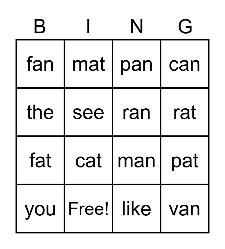 This bingo card has 16 words: Free!, pat, pan, fan, fat, mat, man, like, the, see, you, can, cat, rat, ran and van.