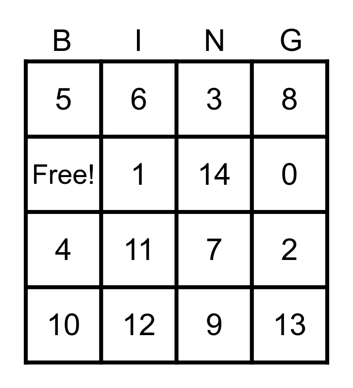 This bingo card has 16 words: 12, 2, 3, 5, 4, 6, 7, 9, Free!, 1, 10, 8, 11, 0, 14 and 13.