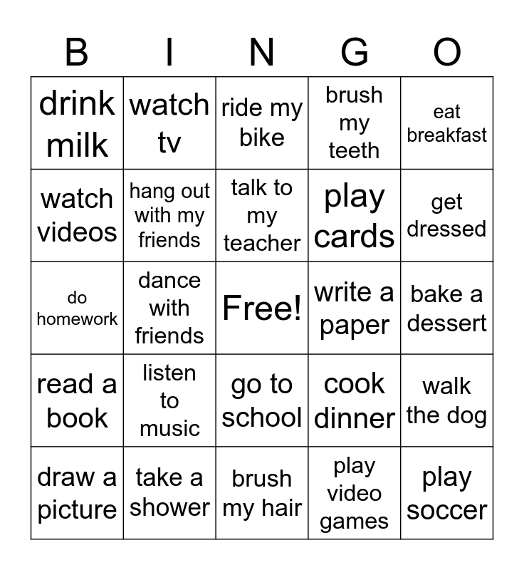 This bingo card has a free space and 28 words: walk the dog, play badminton, play cards, play video games, watch videos, ride my bike, watch tv, read a book, write a paper, draw a picture, do homework, brush my teeth, take a shower, brush my hair, get dressed, wash my hands, listen to music, hang out with my friends, talk to my teacher, go to school, drink milk, have dinner, play soccer, dance with friends, bake a dessert, cook dinner, eat breakfast and eat lunch.