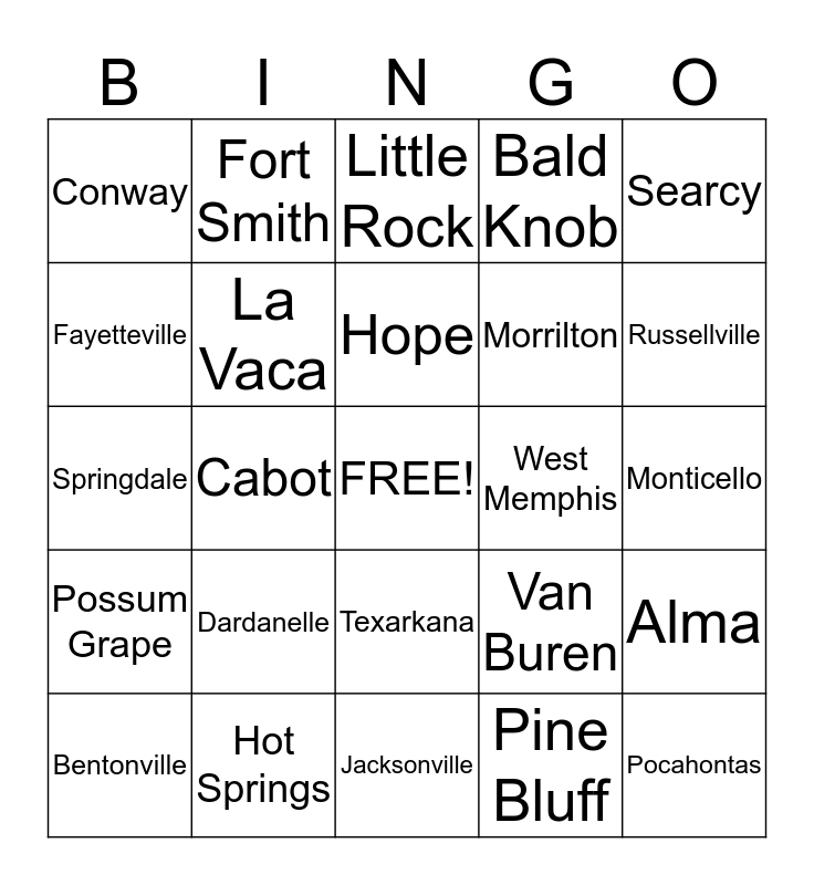 This bingo card has a free space and 24 words: Dardanelle, Hot Springs, Hope, Bentonville, Searcy, Conway, Fayetteville, Fort Smith, West Memphis, Texarkana, Morrilton, Springdale, Van Buren, Alma, La Vaca, Pine Bluff, Monticello, Little Rock, Russellville, Cabot, Pocahontas, Possum Grape, Bald Knob and Jacksonville.