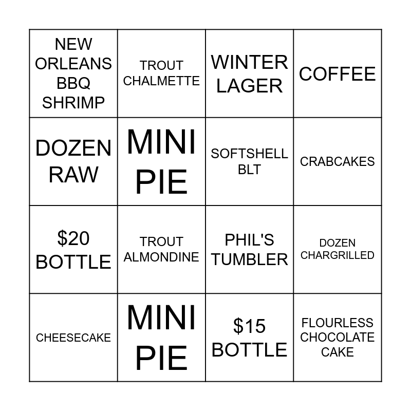 This bingo card has 16 words: MINI PIE, DOZEN CHARGRILLED, WINTER LAGER, NEW ORLEANS BBQ SHRIMP, $20 BOTTLE, TROUT CHALMETTE, PHIL'S TUMBLER, $15 BOTTLE, DOZEN RAW, MINI PIE, CHEESECAKE, COFFEE, TROUT ALMONDINE, CRABCAKES, SOFTSHELL BLT and FLOURLESS CHOCOLATE CAKE.