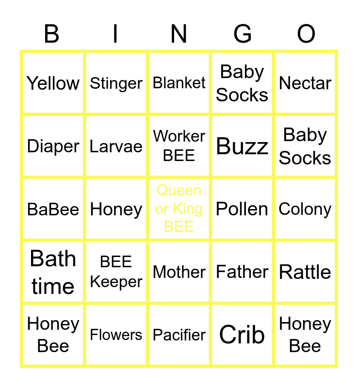 This bingo card has a free space and 24 words: BEE Keeper, Flowers, Worker BEE, Honey Bee, Nectar, Yellow, Diaper, Stinger, Pollen, Mother, Buzz, BaBee, Father, Rattle, Larvae, Crib, Colony, Blanket, Baby Socks, Honey, Honey Bee, Bath time, Baby Socks and Pacifier.