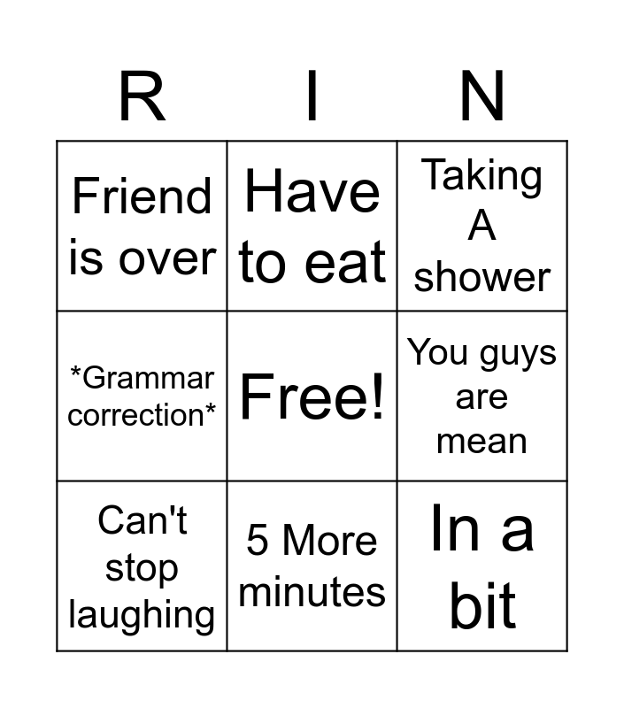 This bingo card has a free space and 8 words: You guys are mean, Taking A shower, Have to eat, Can't stop laughing, Friend is over, In a bit, *Grammar correction* and 5 More minutes.