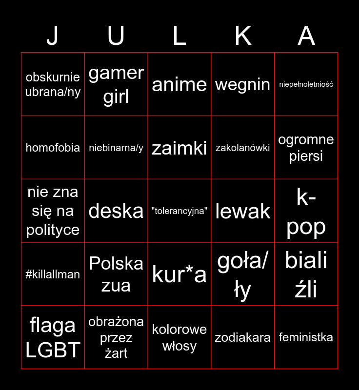 This bingo card has 25 words: Polska zua, kolorowe włosy, zaimki, flaga LGBT, niepełnoletniość, obskurnie ubrana/ny, homofobia, gamer girl, lewak, kur*a, zakolanówki, nie zna się na polityce, goła/ły, biali źli, niebinarna/y, feministka, k-pop, anime, ogromne piersi, deska, "tolerancyjna", obrażona przez żart, #killallman, wegnin and zodiakara.