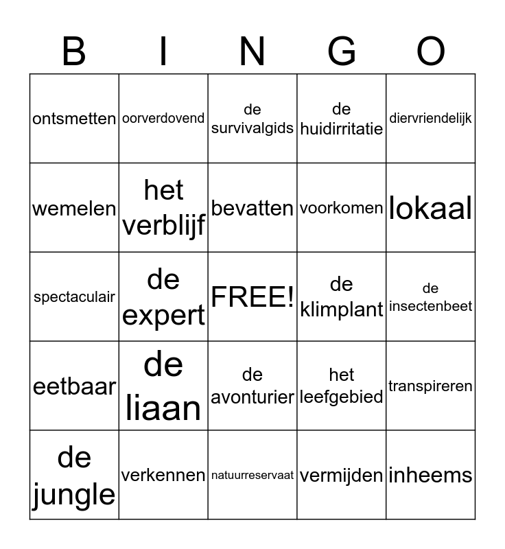 This bingo card has a free space and 40 words: het regenwoud, spectaculair, de tropen, het verblijf, verkennen, de avonturier, bevatten, de bloedzuiger, diervriendelijk, eetbaar, de expert, de huidirritatie, inheems, de insectenbeet, de klimplant, de liaan, het ongedierte, ontsmetten, het paradijs, de survivalgids, transpireren, vermijden, voorkomen, wemelen, de wildernis, afgelegen, communiceren, duurzaam, de expeditie, de gids, de houtkap, de jungle, de klamboe, het leefgebied, lokaal, natuurreservaat, observeren, ongerept, oorverdovend and het opvangcentrum.