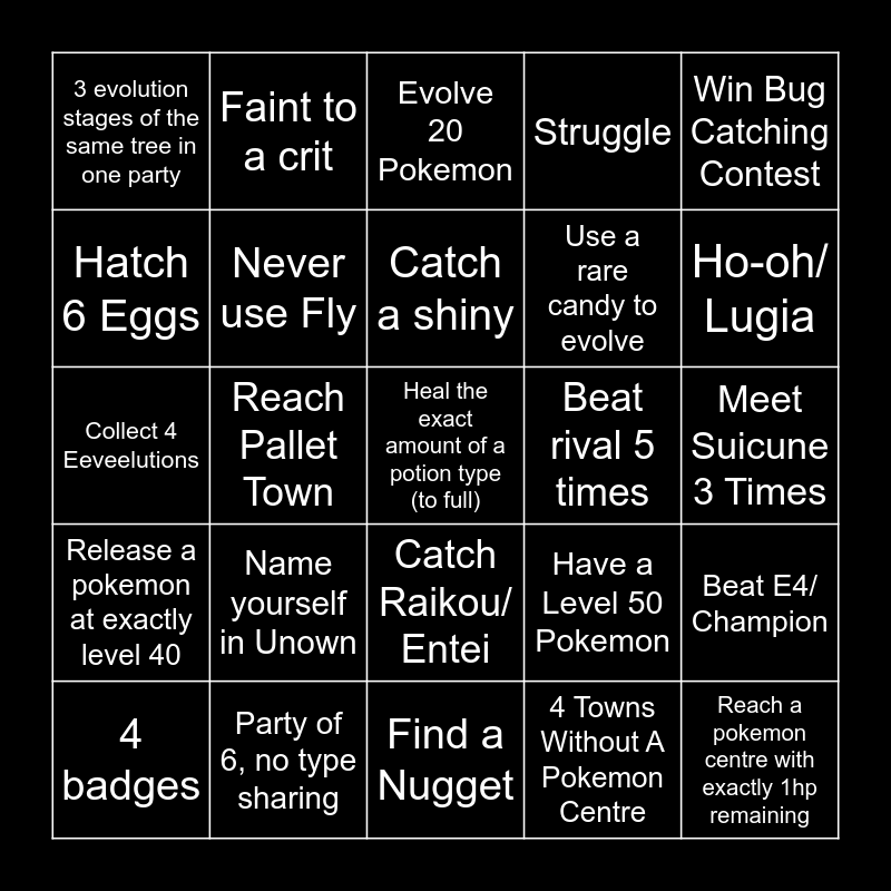 This bingo card has 25 words: Name yourself in Unown, Find a Nugget, Catch a shiny, 4 badges, Win Bug Catching Contest, 3 evolution stages of the same tree in one party, Hatch 6 Eggs, Faint to a crit, Beat rival 5 times, Catch Raikou/ Entei, Use a rare candy to evolve, Collect 4 Eeveelutions, Have a Level 50 Pokemon, Beat E4/ Champion, Never use Fly, Reach a pokemon centre with exactly 1hp remaining, Meet Suicune 3 Times, Evolve 20 Pokemon, Ho-oh/ Lugia, Reach Pallet Town, Heal the exact amount of a potion type (to full), Party of 6, no type sharing, Release a pokemon at exactly level 40, Struggle and 4 Towns Without A Pokemon Centre.