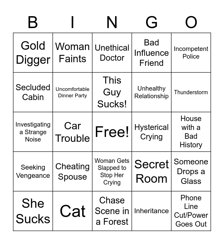 This bingo card has a free space and 24 words: Cheating Spouse, Cat, This Guy Sucks!, She Sucks, Incompetent Police, Gold Digger, Secluded Cabin, Woman Faints, Hysterical Crying, Woman Gets Slapped to Stop Her Crying, Unhealthy Relationship, Investigating a Strange Noise, Secret Room, Someone Drops a Glass, Uncomfortable Dinner Party, Inheritance, House with a Bad History, Unethical Doctor, Thunderstorm, Car Trouble, Phone Line Cut/Power Goes Out, Seeking Vengeance, Bad Influence Friend and Chase Scene in a Forest.
