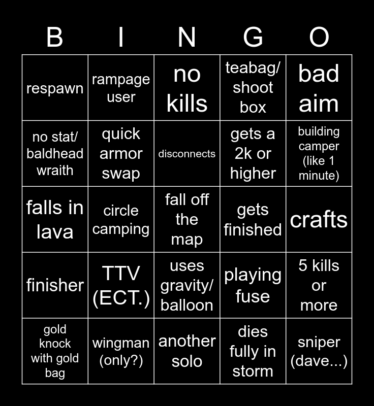 This bingo card has a free space and 28 words: 5 kills or more, dies to throwable, gets a 2k or higher, dies fully in storm, no stat/ baldhead wraith, no kills, rampage user, finisher, gets finished, gold knock with gold bag, falls in lava, teabag/ shoot box, wingman (only?), another solo, building camper (like 1 minute), Warzone player, TTV (ECT.), quick armor swap, disconnects, uses gravity/ balloon, respawn, revive with gold, sniper (dave...), circle camping, crafts, playing fuse, bad aim and kill leader.
