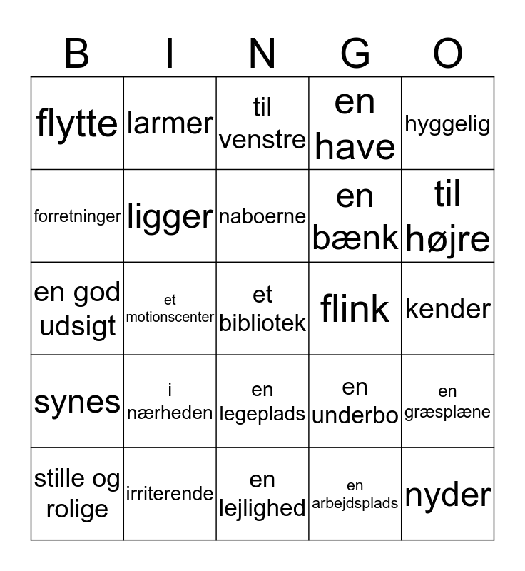 This bingo card has 25 words: i nærheden, en lejlighed, naboerne, stille og rolige, hyggelig, flytte, forretninger, larmer, flink, en legeplads, en bænk, en god udsigt, en underbo, en græsplæne, ligger, nyder, kender, til venstre, til højre, et motionscenter, et bibliotek, irriterende, synes, en have and en arbejdsplads.