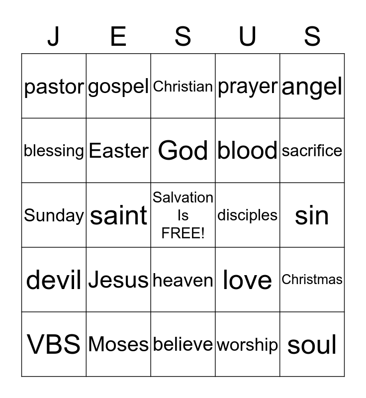 This bingo card has a free space and 24 words: Jesus, Moses, God, VBS, angel, pastor, blessing, gospel, disciples, heaven, blood, Sunday, love, Christmas, Easter, worship, sin, Christian, sacrifice, saint, soul, devil, prayer and believe.