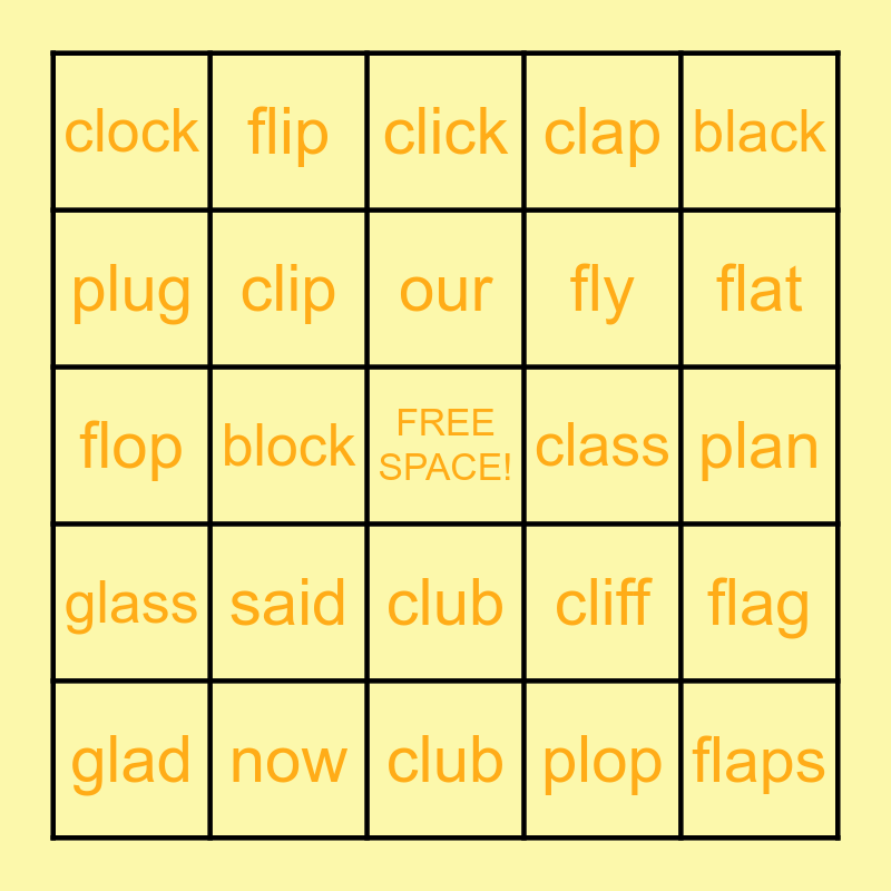 This bingo card has a free space and 24 words: said, now, our, glad, black, clock, plug, flip, class, club, fly, flop, cliff, flag, clip, plop, plan, click, flat, block, flaps, glass, clap and club.