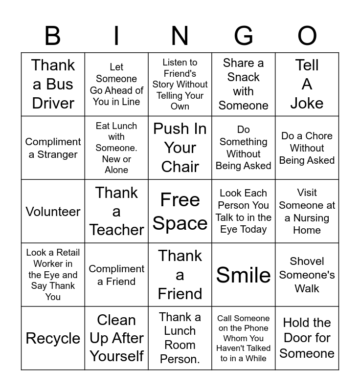This bingo card has a free space and 24 words: Compliment a Friend, Clean Up After Yourself, Push In Your Chair, Recycle, Tell A Joke, Thank a Bus Driver, Compliment a Stranger, Let Someone Go Ahead of You in Line, Look Each Person You Talk to in the Eye Today, Thank a Friend, Do Something Without Being Asked, Volunteer, Smile, Shovel Someone's Walk, Eat Lunch with Someone. New or Alone, Call Someone on the Phone Whom You Haven't Talked to in a While, Visit Someone at a Nursing Home, Listen to Friend's Story Without Telling Your Own, Do a Chore Without Being Asked, Thank a Teacher, Hold the Door for Someone, Look a Retail Worker in the Eye and Say Thank You, Share a Snack with Someone and Thank a Lunch Room Person..