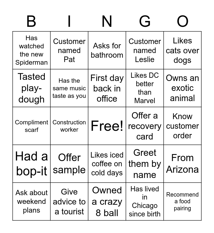 This bingo card has a free space and 24 words: Offer sample, Give advice to a tourist, First day back in office, Ask about weekend plans, Likes cats over dogs, Has watched the new Spiderman, Tasted play-dough, Customer named Pat, Offer a recovery card, Likes iced coffee on cold days, Likes DC better than Marvel, Compliment scarf, Greet them by name, From Arizona, Has the same music taste as you, Has lived in Chicago since birth, Know customer order, Asks for bathroom, Owns an exotic animal, Construction worker, Recommend a food pairing, Had a bop-it, Customer named Leslie and Owned a crazy 8 ball.