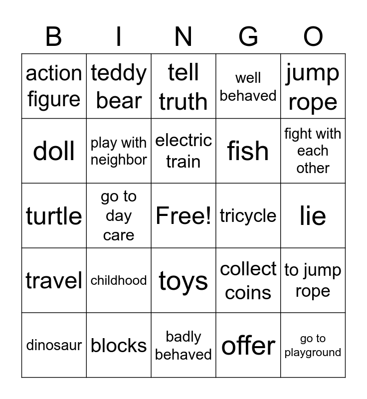 This bingo card has a free space and 24 words: childhood, blocks, electric train, dinosaur, jump rope, action figure, doll, teddy bear, tricycle, toys, fish, turtle, collect coins, to jump rope, play with neighbor, offer, lie, tell truth, fight with each other, go to day care, go to playground, travel, well behaved and badly behaved.