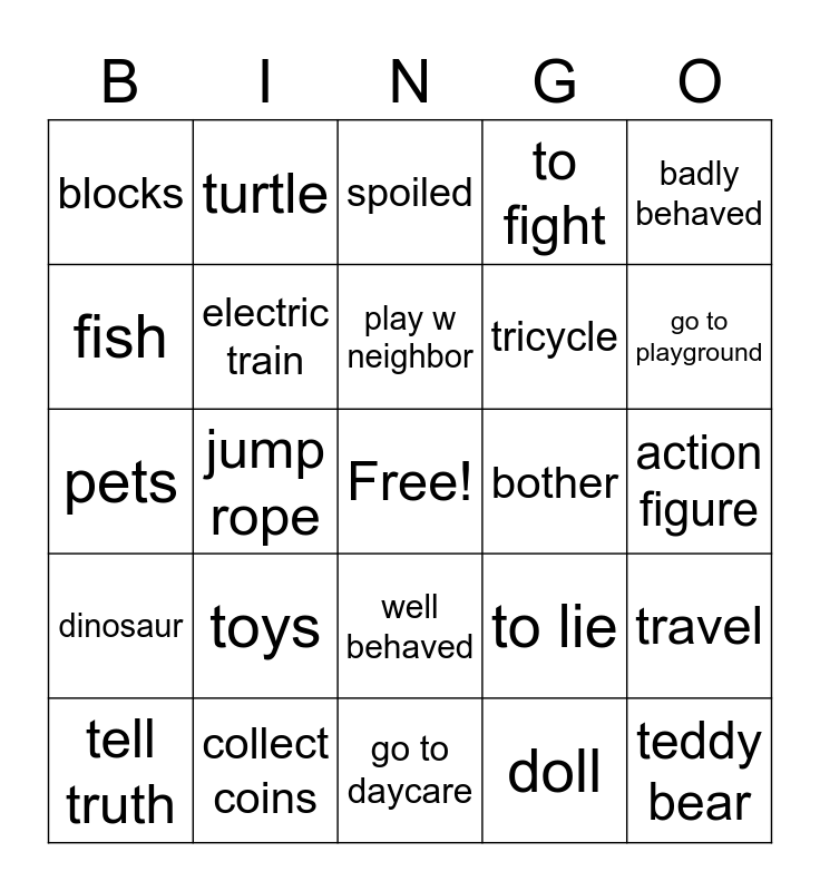 This bingo card has a free space and 24 words: toys, collect coins, play w neighbor, tell truth, badly behaved, blocks, fish, turtle, bother, well behaved, tricycle, pets, to lie, travel, electric train, doll, action figure, spoiled, go to playground, jump rope, teddy bear, dinosaur, to fight and go to daycare.